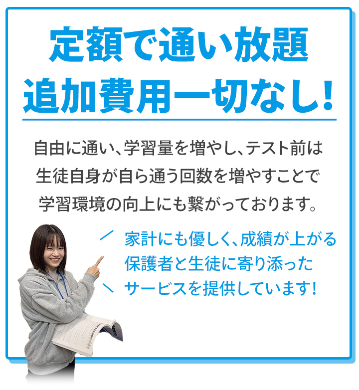 また、当塾は他塾と大きく異なる「定額制の通い放題コース」というものを導入しております。