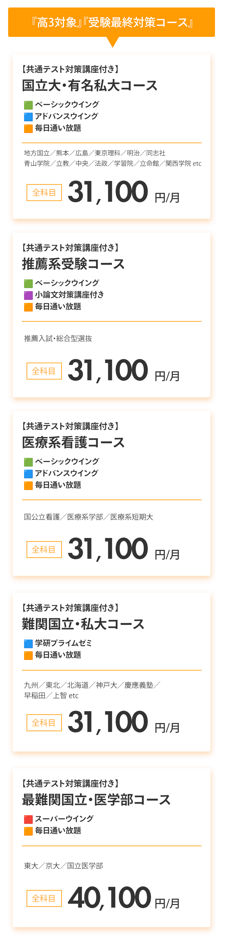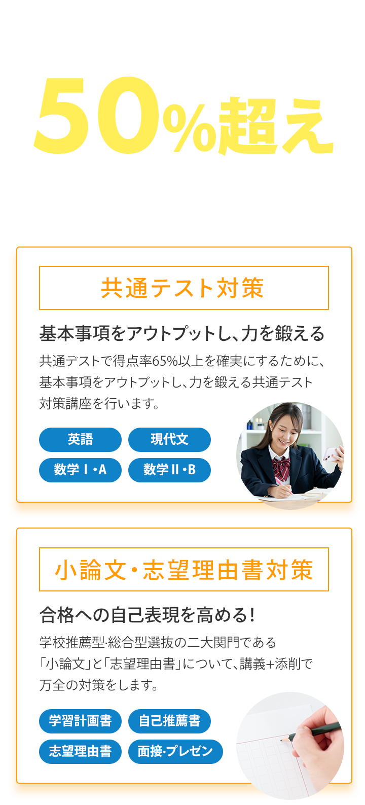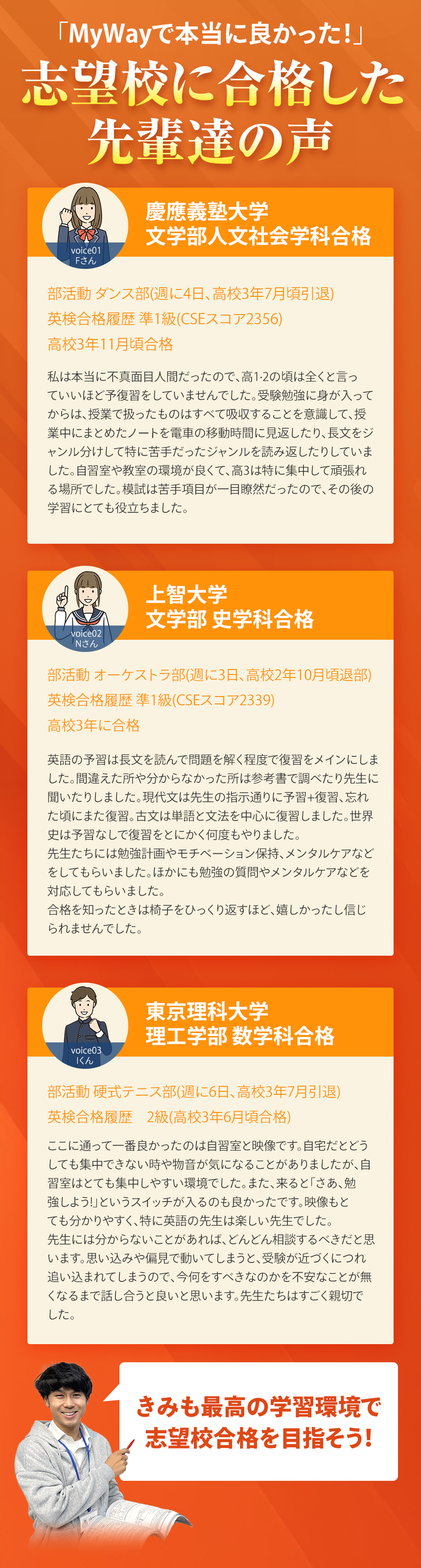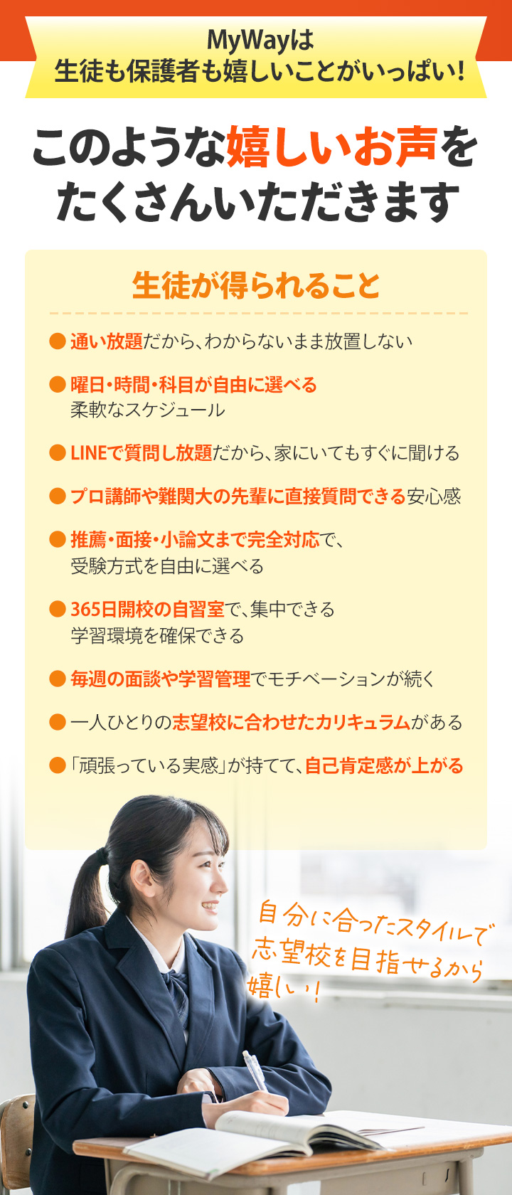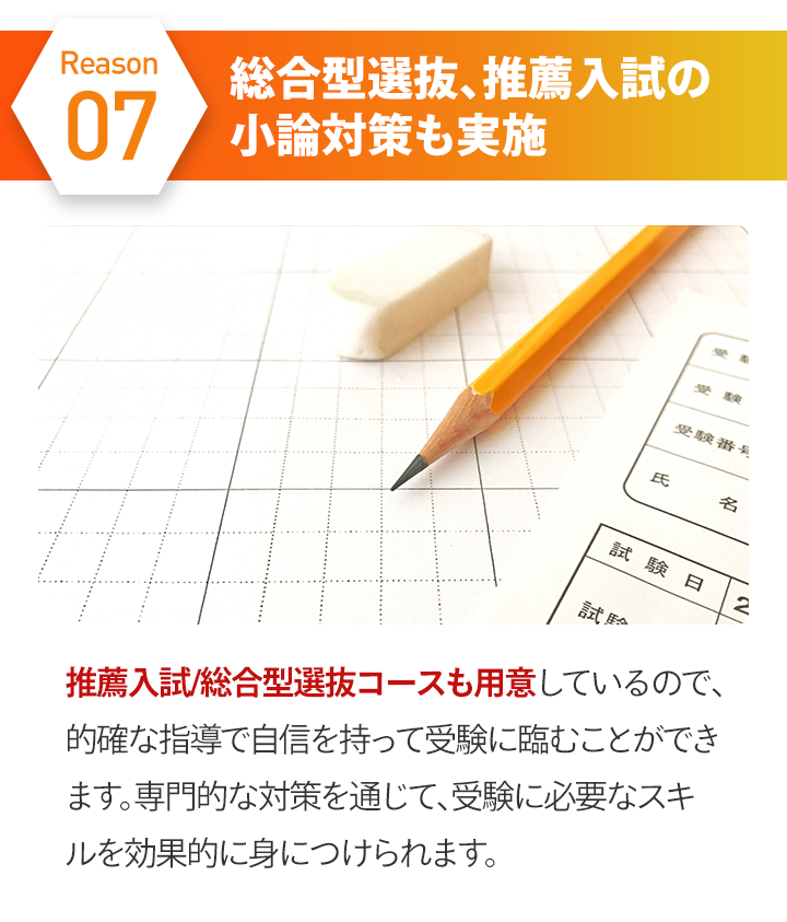 他塾のような汎用性の受験対策とは違い、志望大学ごとの傾向に合わせて対策をすることで成績アップに直結します。