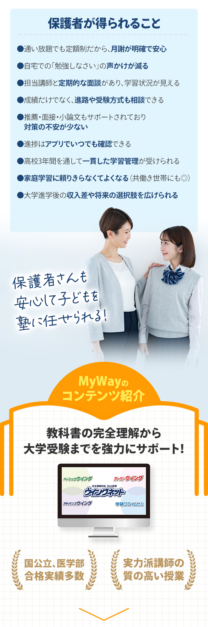| My Way | 保護者との連携も大切にしており、登下校連絡やご相談はLINEでスムーズに対応。 専用アプリでは時間割や学習状況も確認できるため(高1・2のみ)、ご家庭でも安心して見守っていただけます。 |