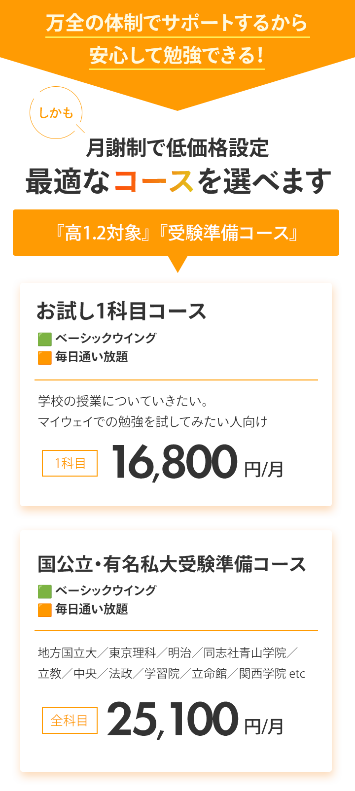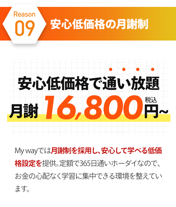 | My Way | どのご家庭でも通いやすい、業界最安値の安心の定額制 16,800円~/月 <追加費用なし> |
