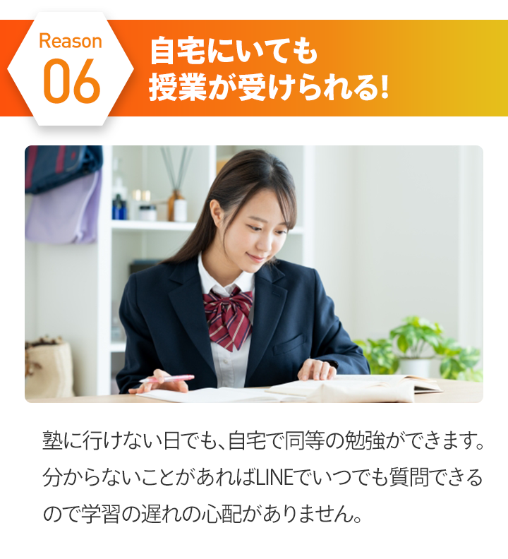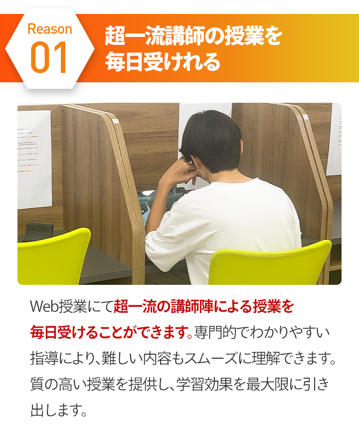 授業はオンラインと教室での対面の両方で受けられます。自宅にいても高品質な授業を受けられ、教室では直接質問ができる環境が整っています。