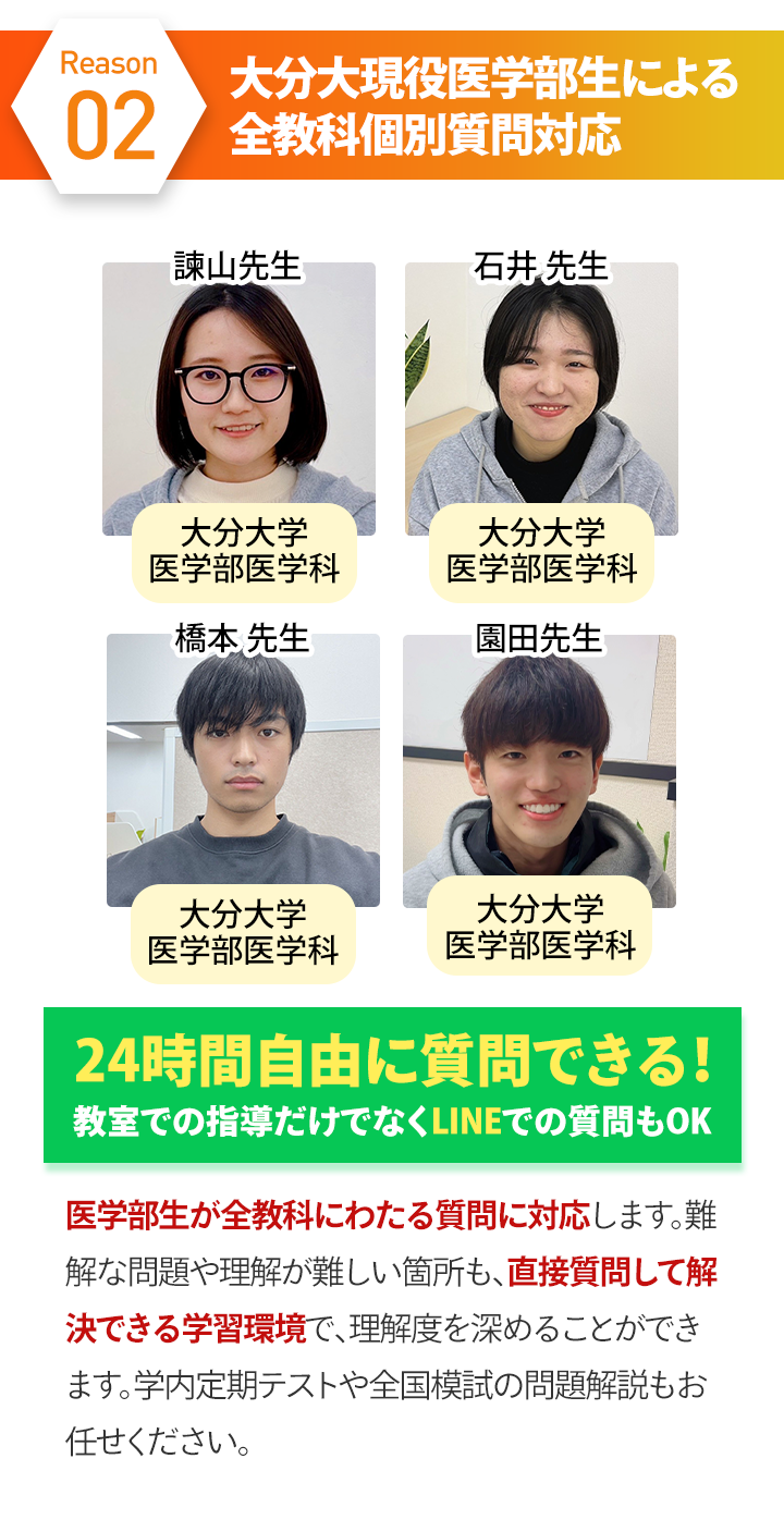 また、私たちの塾では医学部生による質問対応を実施しています。勉強の中でわからないことがあれば、いつでも相談してください。彼らは皆さんの力強いサポーターであり、同じ道を歩んだ先輩でもあります。