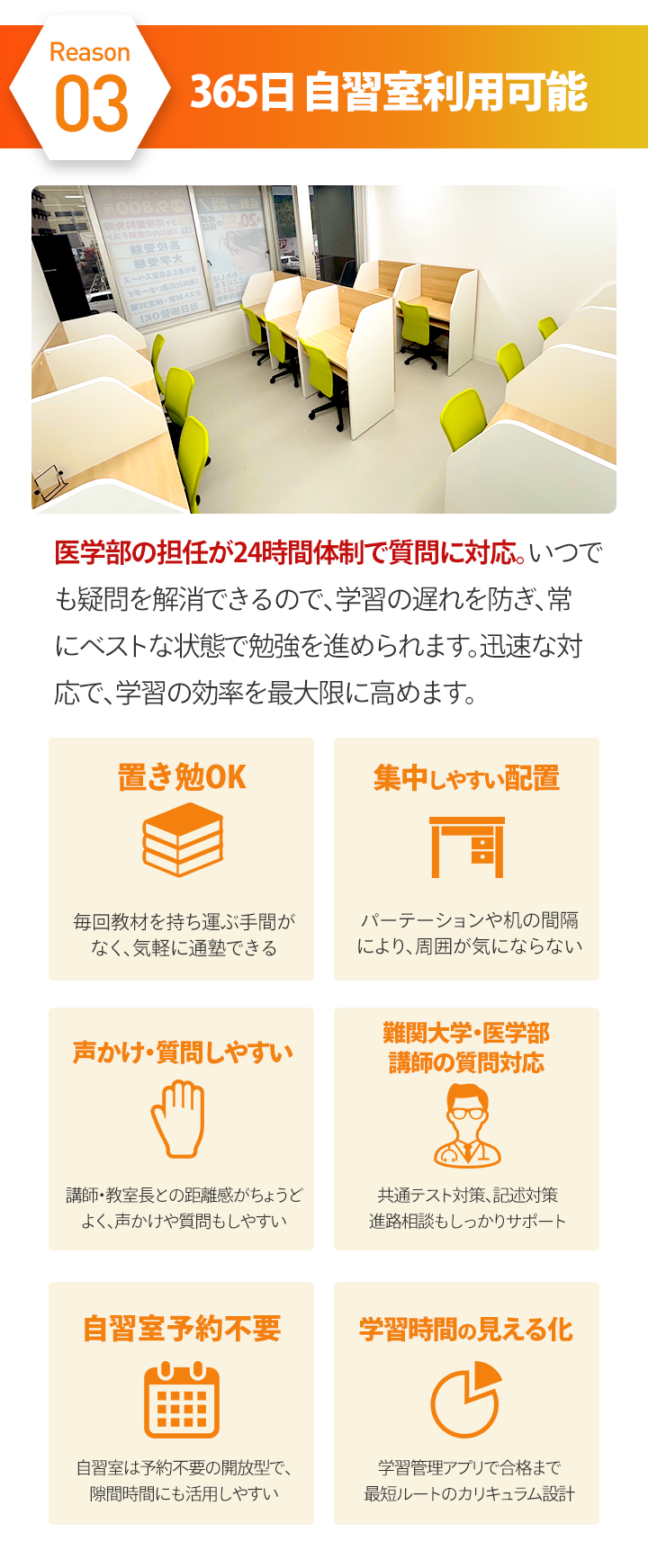 自習室は365日、06:00から22:00まで利用可能です。集中して勉強できる環境が整っており、質問があればすぐに対応できる体制が整っています。