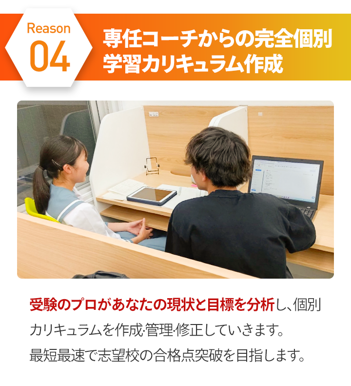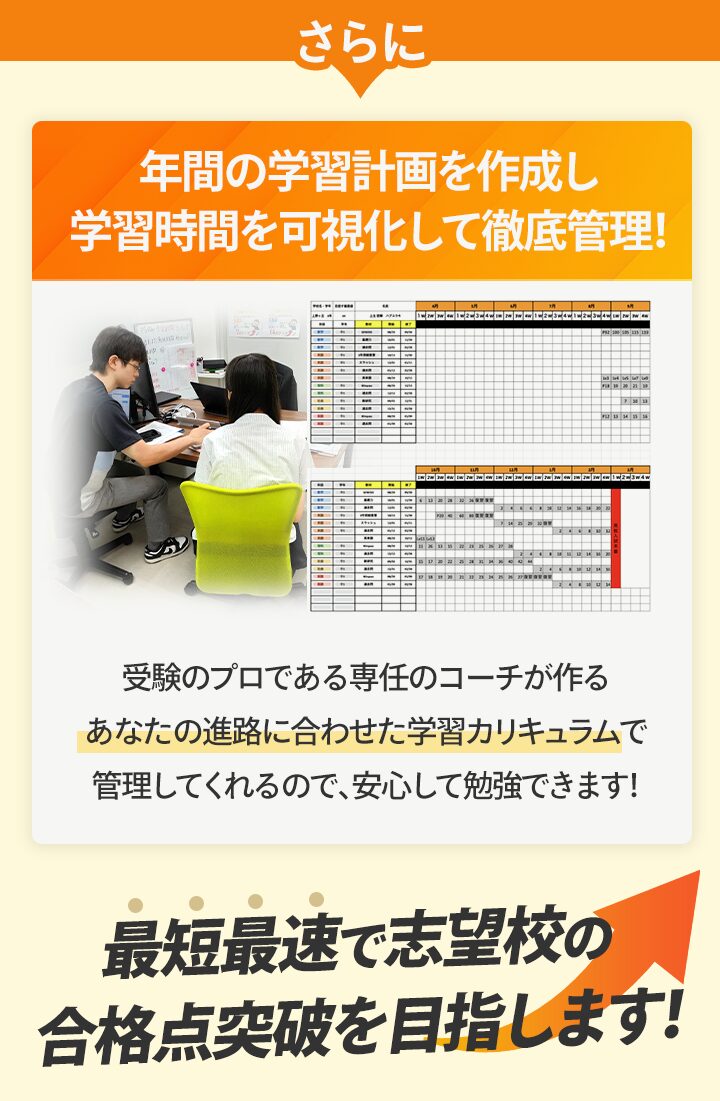 また、受験生が勉強に集中できる場所と24時間いつでも受験のプロに質問ができる最高の学習環境を提供をすることや、専属コーチが生徒の学力に応じて最適なカリキュラムを作成し、苦手な分野や学習の目安を可視化して重点的に学習行っていきます。