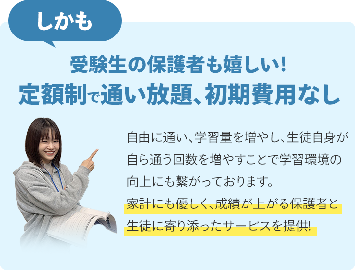 受験には多くの不安がつきものですが、当塾ではその一つである「月謝の負担」を少しでも軽減したいと考えています。私たちは、安全で安心な月謝制度を導入し、明確で納得のいく料金体系を心掛けています。某大手予備校のような高額な月謝は不要です。予算を気にせず、安心してお子様の未来を託していただけます。